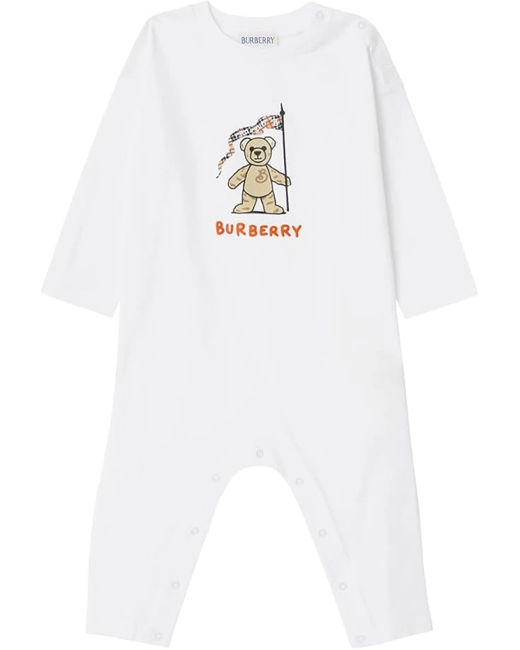 - Cuddle in style: Adorable comfort for tiny trendsetters styling Burberry® Kids Casey Bear Set. This charming two-piece gift set includes a mid-rise jumpsuit and a matching bandana bib, crafted from soft jersey for all-day comfort. Featuring a press-stud gusset and shoulder for easy dressing, plus a bib with a secure press-stud closure, this set ensures effortless functionality. Adorned with a playful seasonal Thomas Bear graphic and iconic Burberry lettering, it’ a perfect blend of fashion and practicality.
