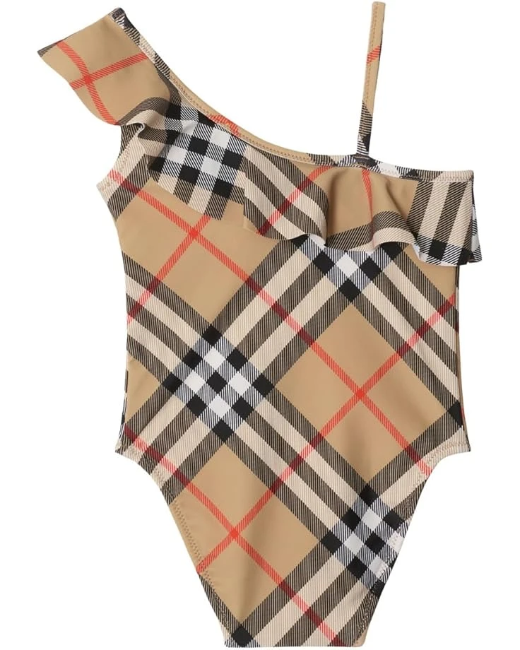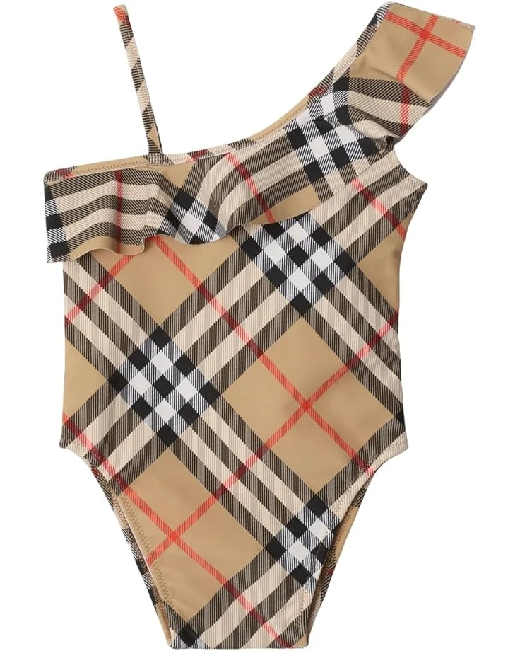 - Make a splash in iconic style in the Burberry® Kids Fern Check Swimsuit, where classic charm meets modern flair. This asymmetric design in stretch nylon boasts the timeless Burberry Check print, adding a sophisticated edge to poolside fun. The ruffled neckline gives a playful, feminine touch, while the stretchy fabric ensures comfort and flexibility for all-day wear. A standout piece from Burberry Classics, this swimsuit is perfect for little fashionistas who appreciate style with a unique twist.