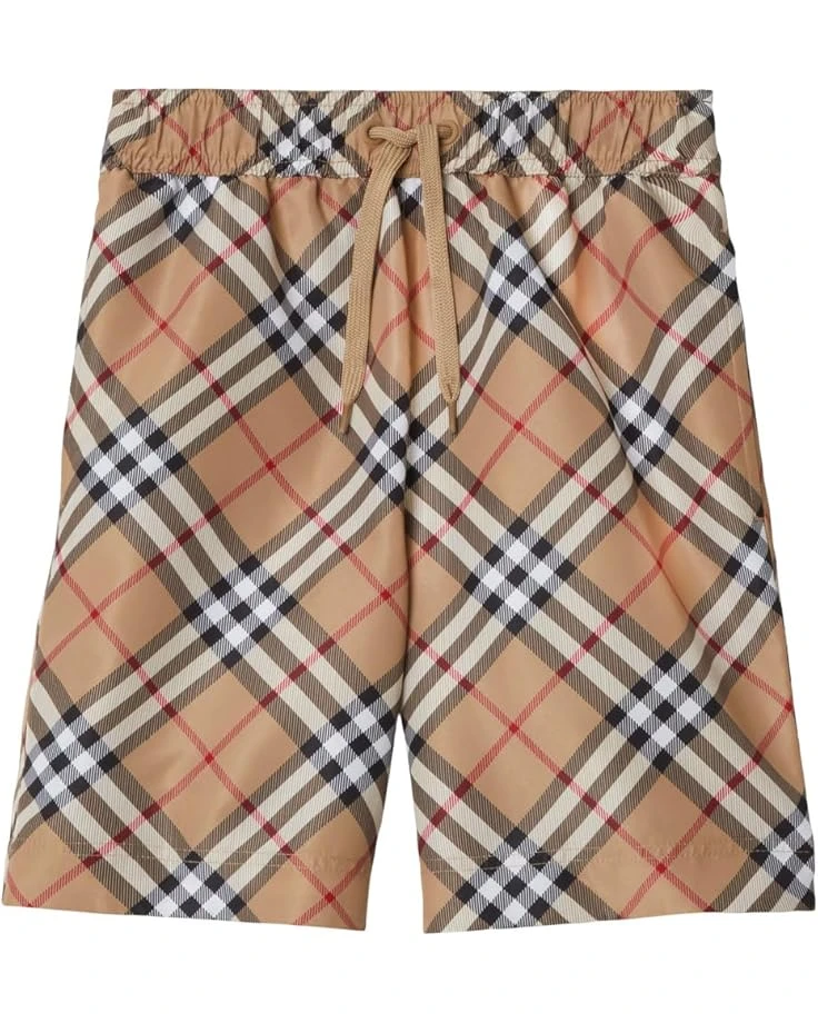 - Upgrade your little one’s swimwear collection by adding the Burberry® Kids Malcolm Check Swim Shorts. The pull-on style shorts have a comfortable waistband with a drawstring closure for a custom fit. The breathable shorts have an intricate design allover.