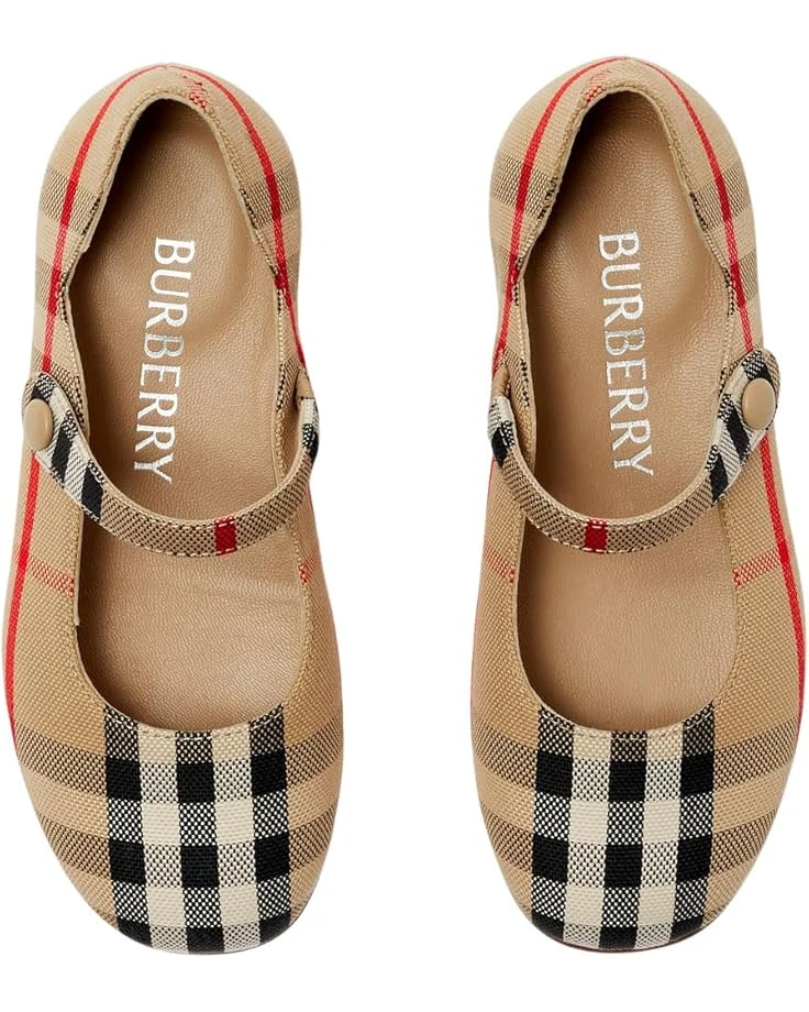 - Featuring classic Burberry check print all over, the Burberry® Kids Seth Check shoes are an ideal footwear choice to match your kid’s comfort and style. Lightweight and comfy, these scalloped flats offer your kid a comfortable walking experience. Perfect to pair with different outfits and styles, these ballerina shoes for toddlers come with an elastic strap with a snap closure that offers durable support and fit.